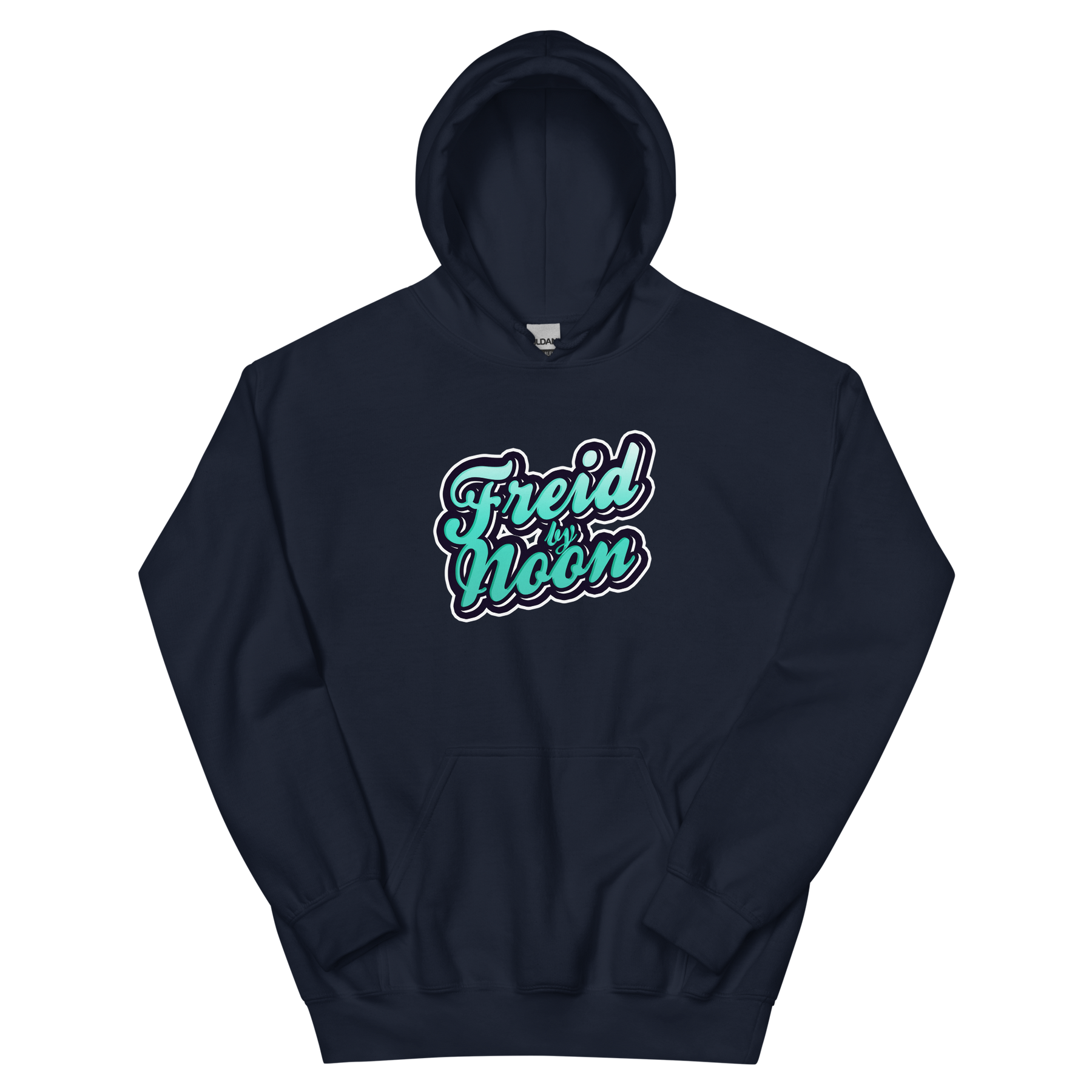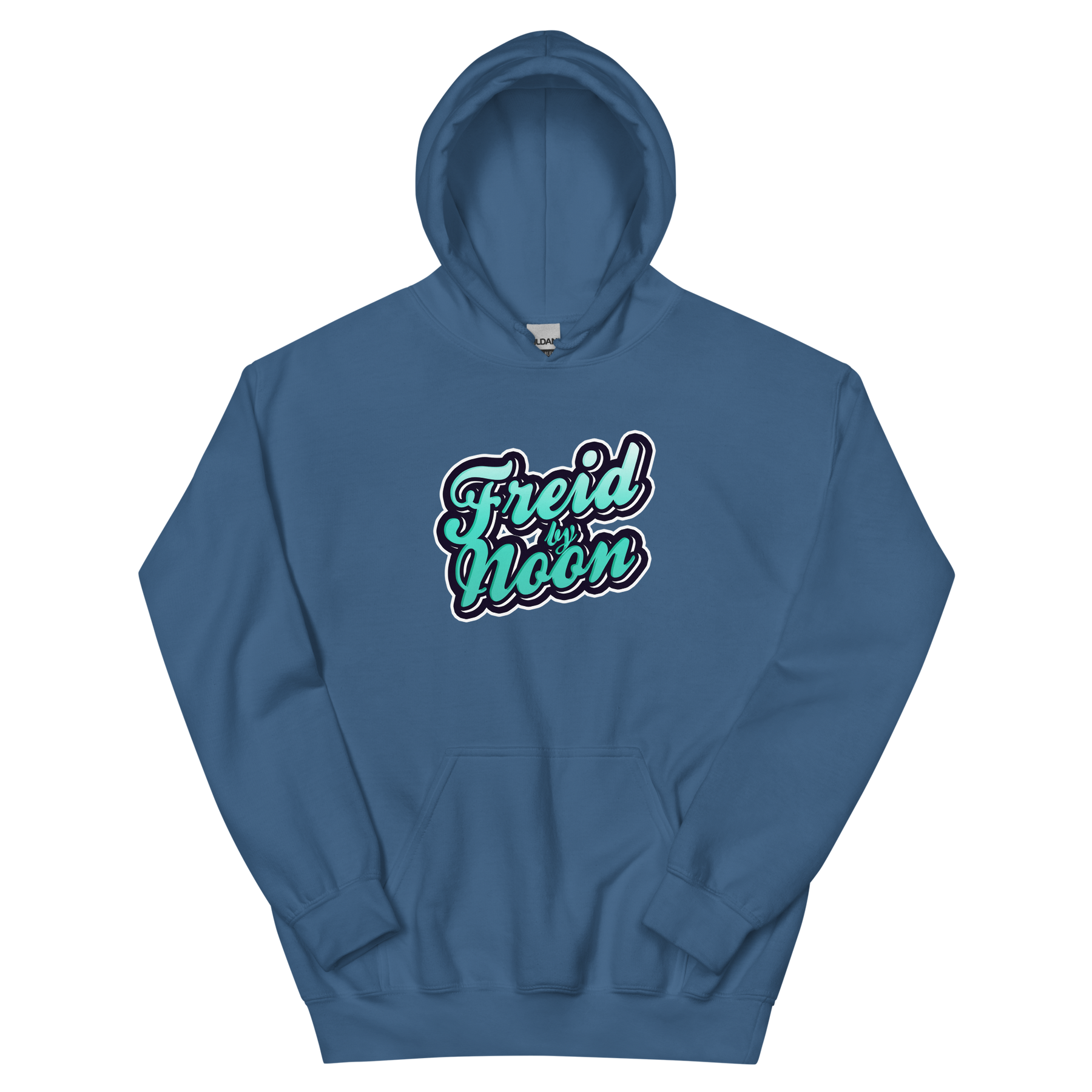 "Freid by Noon" printed in blue, white, and black. Available in multiple color options. Product details: