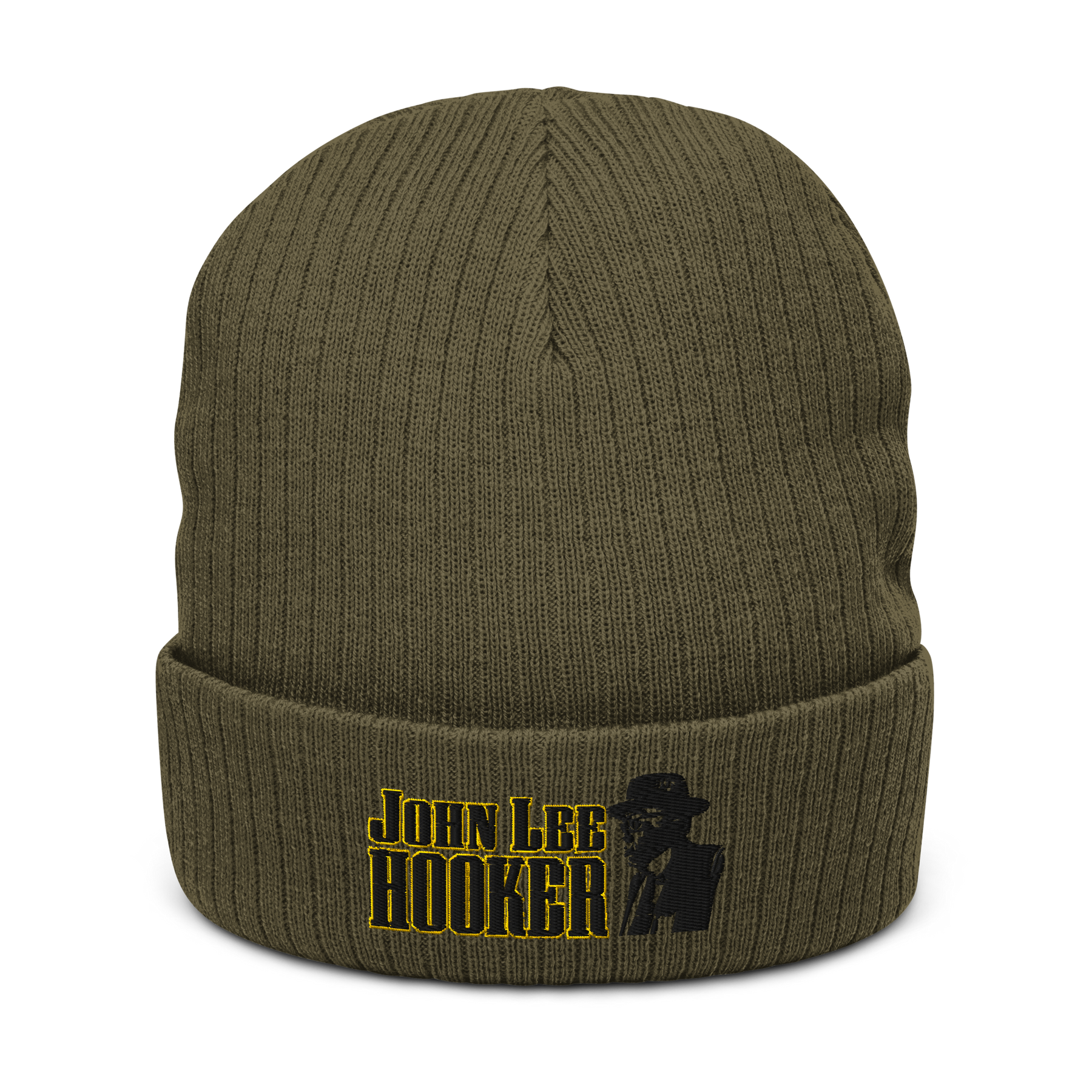 Ribbed knit beanie featuring John Lee Hooker logo. Available in Navy, Olive, and Mustard.