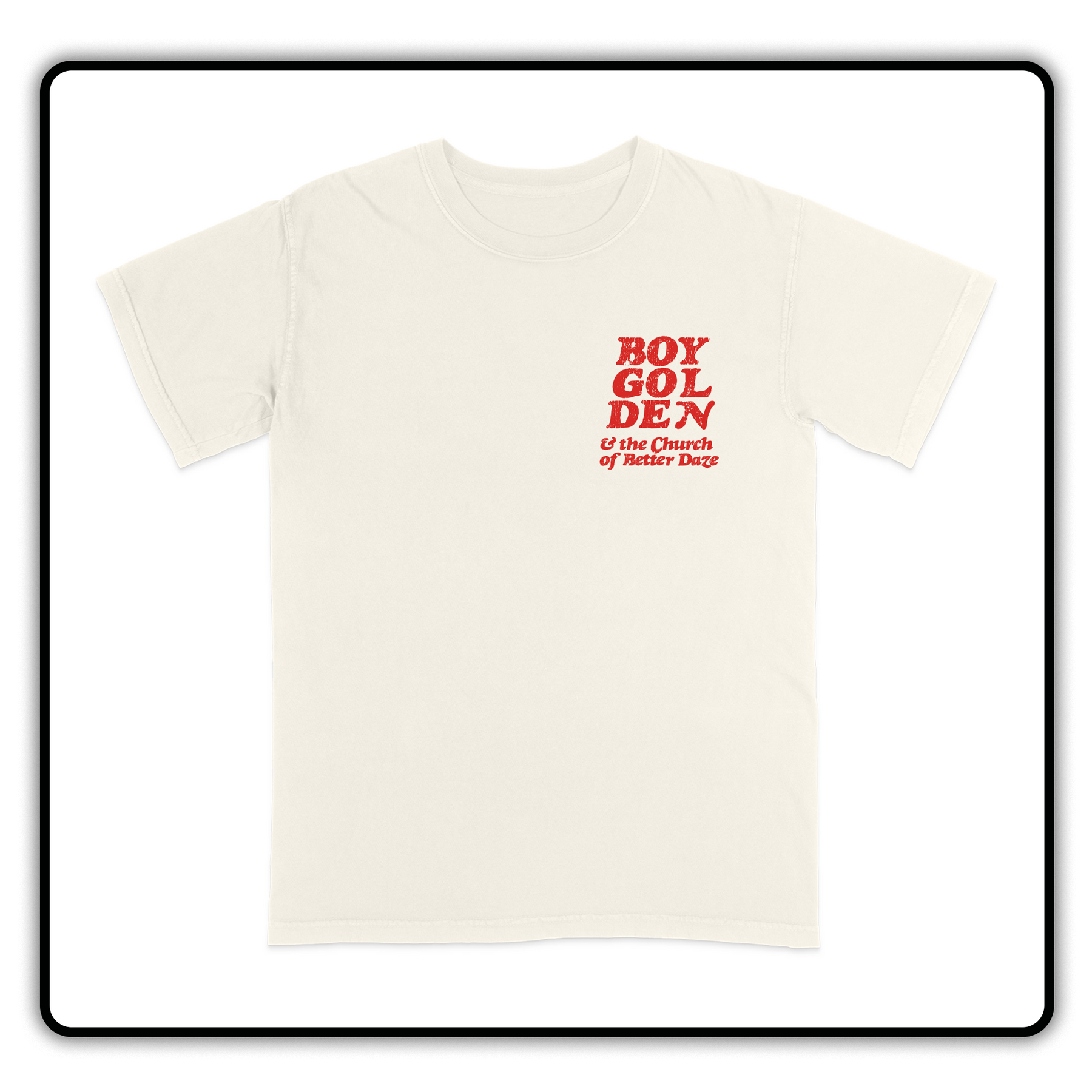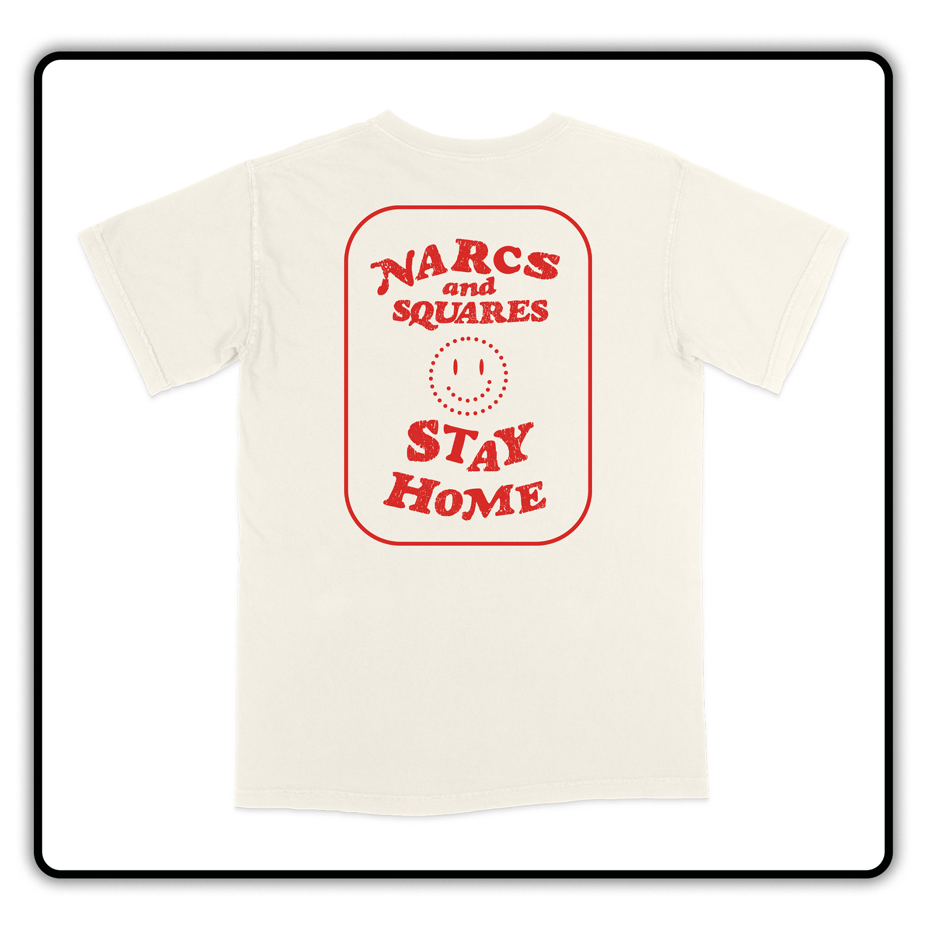 Narcs and Squares design printed on the front of a natural colored tee.