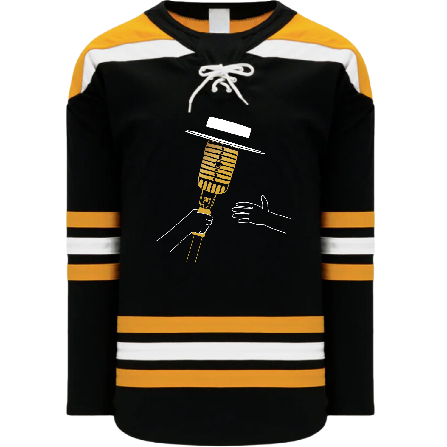 Authentic black hockey jersey featuring the original Pass The Mic hands logo embroidery on the front and the original Pass The Mic verbiage logo embroidery on the back.