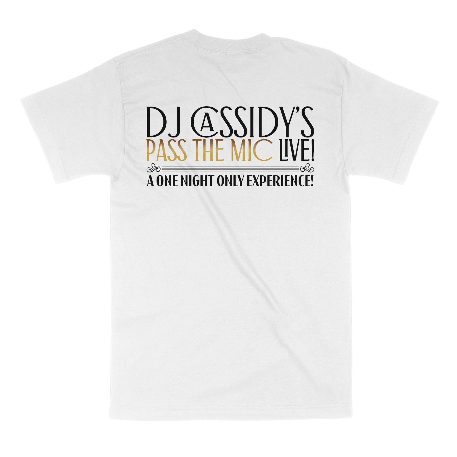 Heavyweight white tee featuring the original Pass The Mic hands logo on the front and “A one night only experience” verbiage on the back.